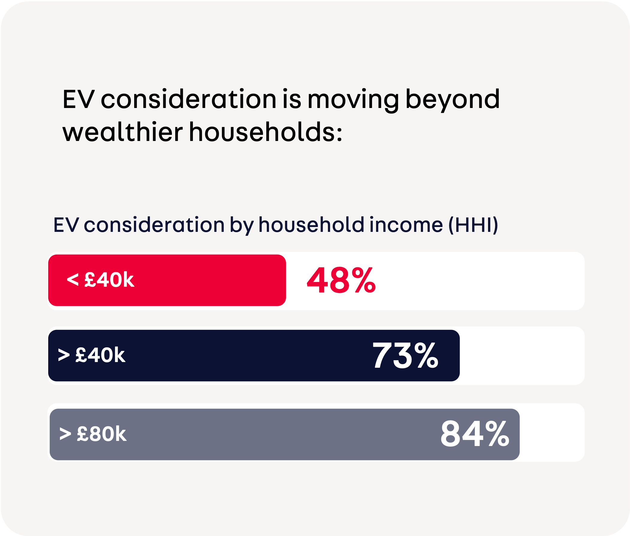 For households earning less than £40,000, consideration drops to less than half (48%) whilst households earning above £80,000 have much higher consideration at 84%.